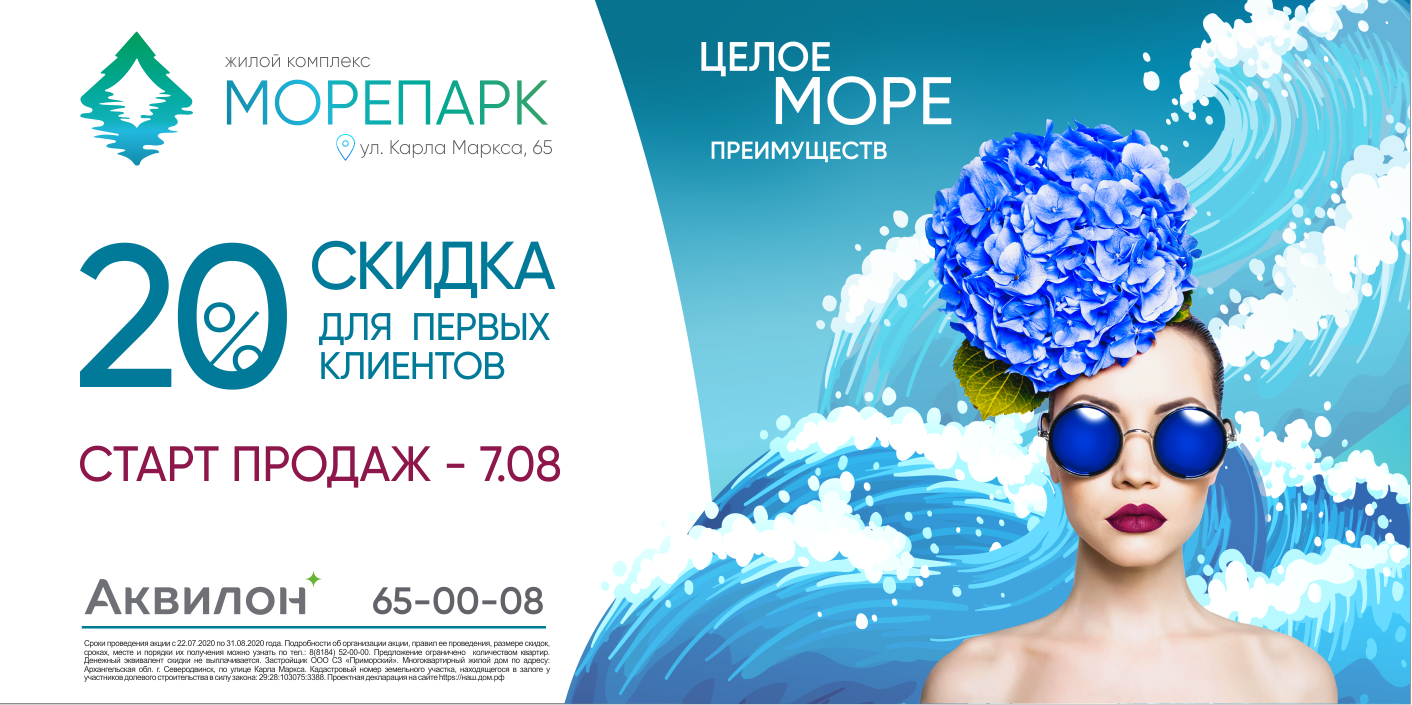 7 августа стартуют продажи квартир в ЖК «Морепарк», который Группа «Аквилон» возводит в городе корабелов на ул. Карла Маркса, 65. Первых покупателе ждет скидка в 20%*.