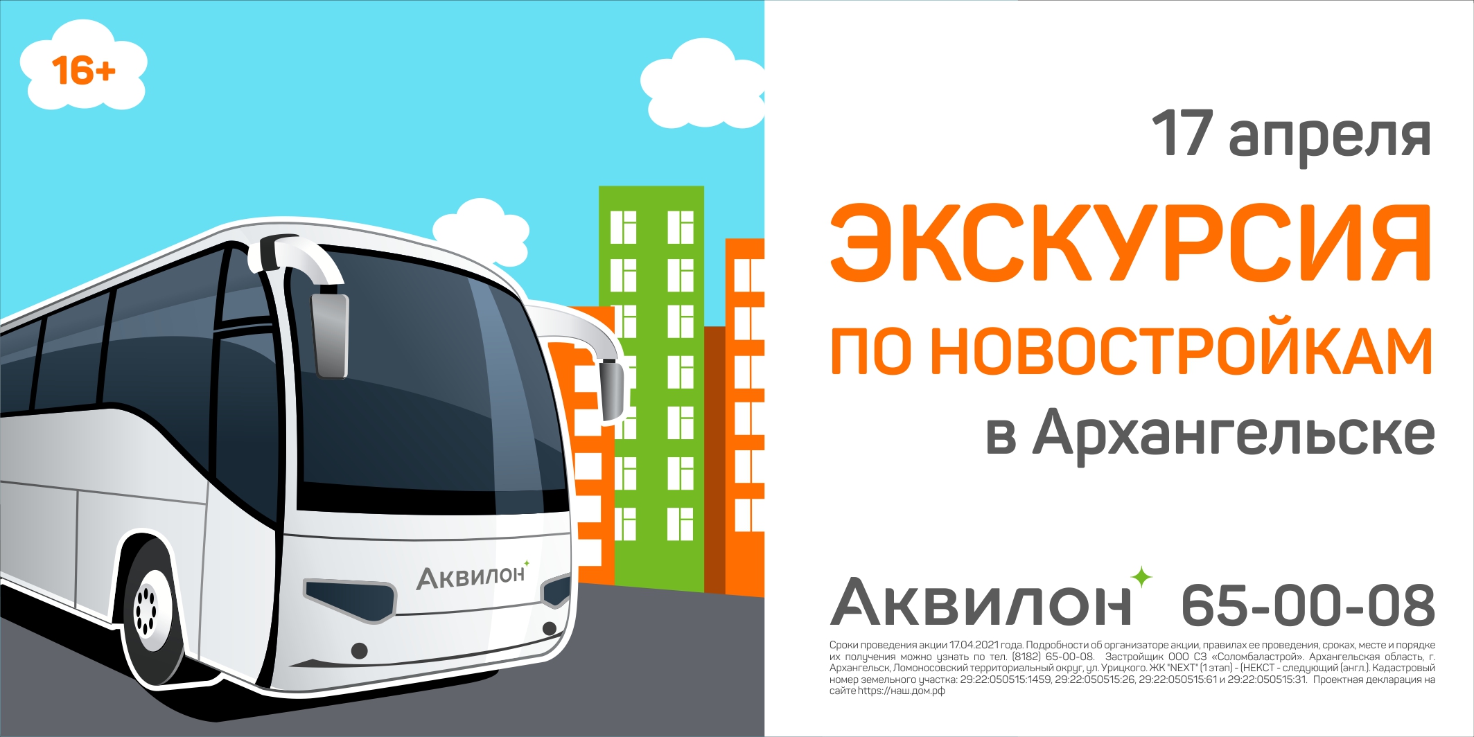 Архангелогородцы смогут увидеть все локации жилых комплексов и перспективных объектов, оценить своими глазами технологии и ход строительства, уровень и качество отделки White box, в которой сдаются все квартиры, и многое другое! На экскурсии специалисты группы «Аквилон» помогут найти квартиру с удобным эргономичным решением и чудесным видом из окна в удобном районе города: Ломоносовском, Октябрьском, Соломабальском, а также Майской горке. По окончании мероприятия все участники получат бесплатную консультацию ипотечного брокера о самом выгодном варианте ипотечного кредитования. Предварительная запись обязательна. Количество мест ограничено. Мероприятие строго для лиц старше 16 лет.